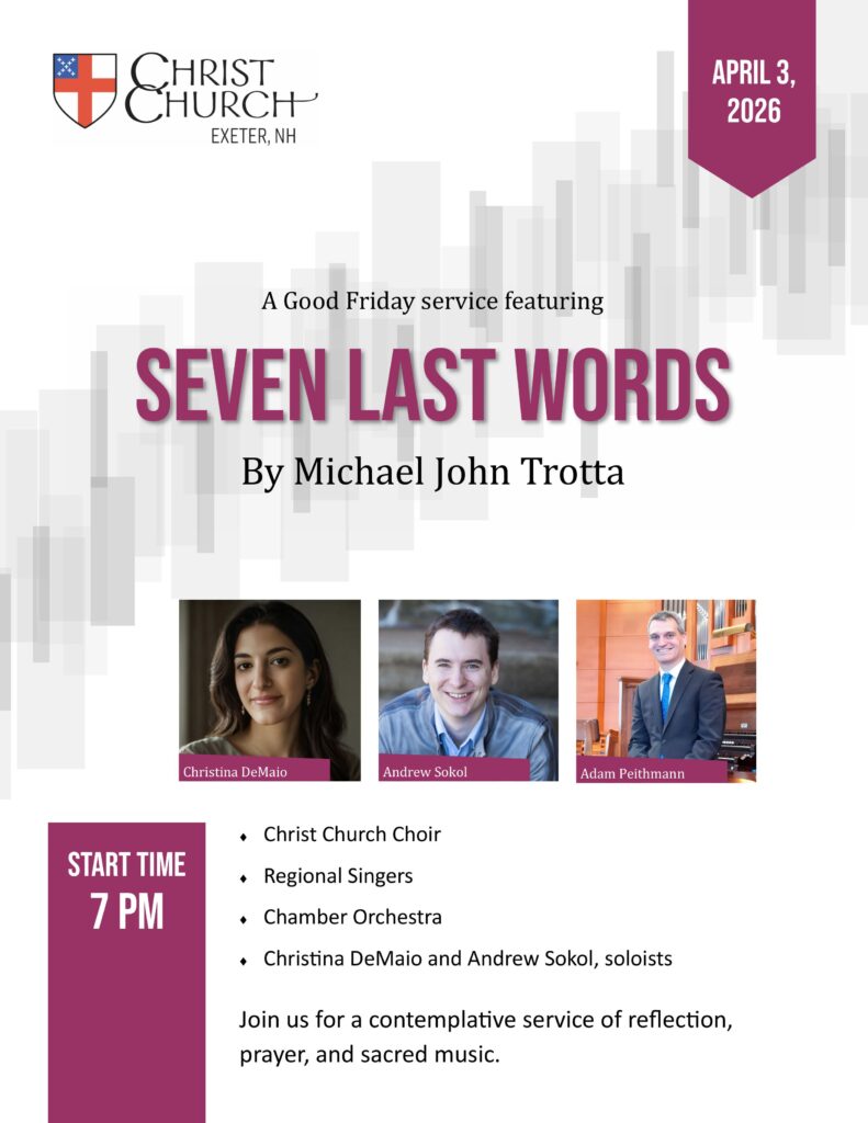 The choir sings at the 10:00 am service most Sundays between Labor Day and Memorial Day, with special offerings on Christmas Eve and Good Friday. Music reading is not required, but singing experience is helpful. Email Director of Music Adam Peithmann at apeithmann@christchurchexeter.org with inquiries.